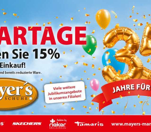 Mayer's Markenschuhe feiert Jubiläum! Vom 20. bis 22. November finden daher bei unserem Mayer's Markenschuhe wieder die Spartage statt. Bei Vorlage der Spartagekarte (das Motiv, welches oben angezeigt wird) erhalten Sie 15 % Rabatt auf gekennzeichnete Artikel.Viel Spaß beim Shoppen und Sparen!