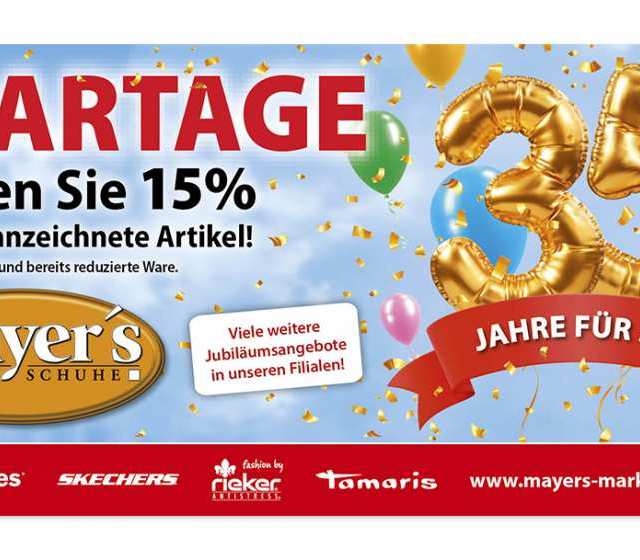 Mayer's Markenschuhe feiert Jubiläum! Vom 25. bis 27. September finden daher bei unserem Mayer's Markenschuhe wieder die Spartage statt. Bei Vorlage der Spartagekarte (das Motiv, welches oben angezeigt wird) erhalten Sie 15 % Rabatt auf gekennzeichnete Artikel.Viel Spaß beim Shoppen und Sparen!