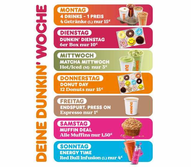Diese Woche wird’s richtig lecker bei DUNKIN'! Entdecken Sie die Wochenangebote und gönnen Sie sich einen süßen Moment. Egal, ob klassische Donuts, leckere Muffins oder perfekter Coffee-to-go. Freuen Sie sich auf täglich wechselnde Deals, die ideal für die Pause beim Shoppen, den schnellen Genuss zwischendurch oder zum Mitnehmen für Freunde und Familie sind.