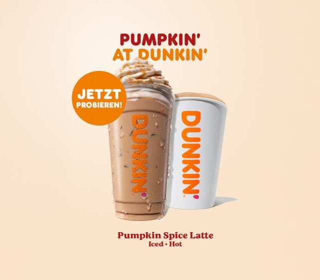 Die beliebteste Geschmacksrichtung des Herbstes ist zurück! Genießen Sie bei DUNKIN’ den neuen Pumpkin Spice Latte – wahlweise hot oder iced.Probieren Sie beide aus und entdecken Sie Ihren neuen Lieblingsdrink für den Herbst – Jetzt in der Goethe Galerie Jena!