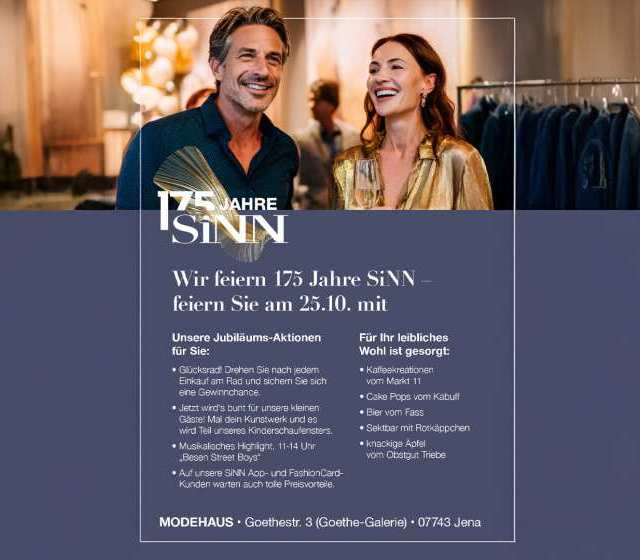 Feiern Sie mit uns 175 Jahre Mode, Stil und Lebensfreude – wir freuen uns auf Ihren Besuch in der Goethe Galerie Jena!